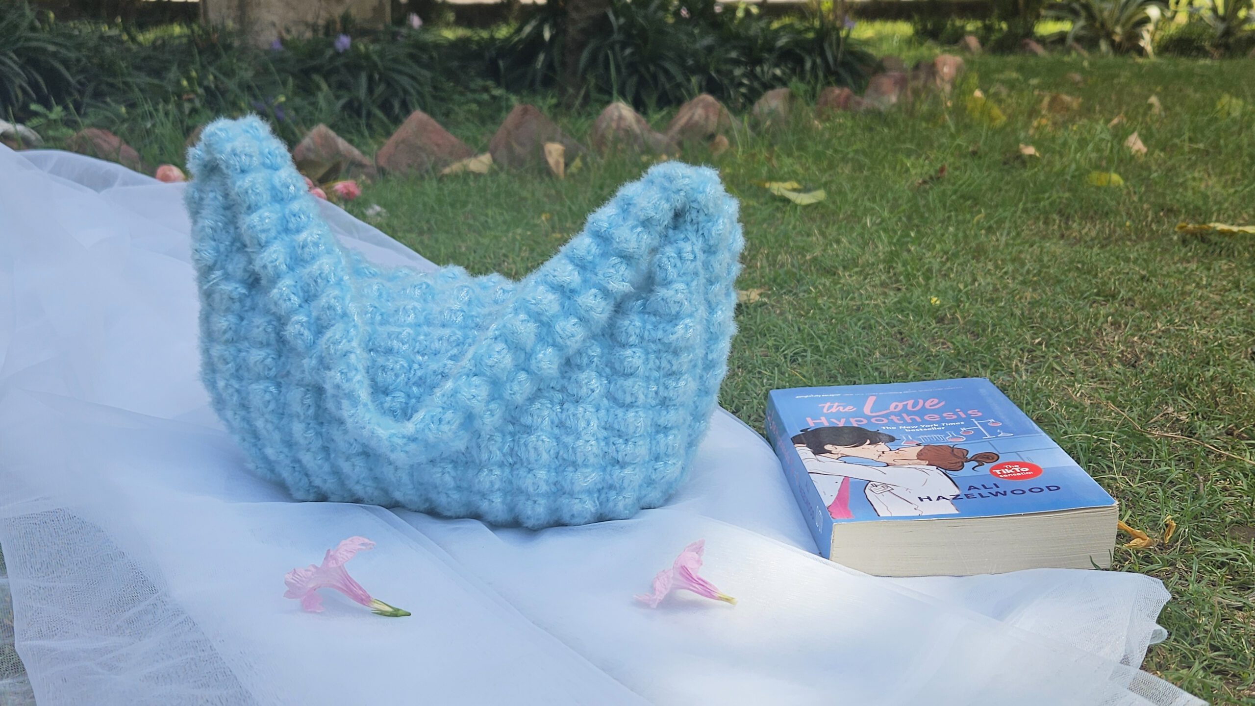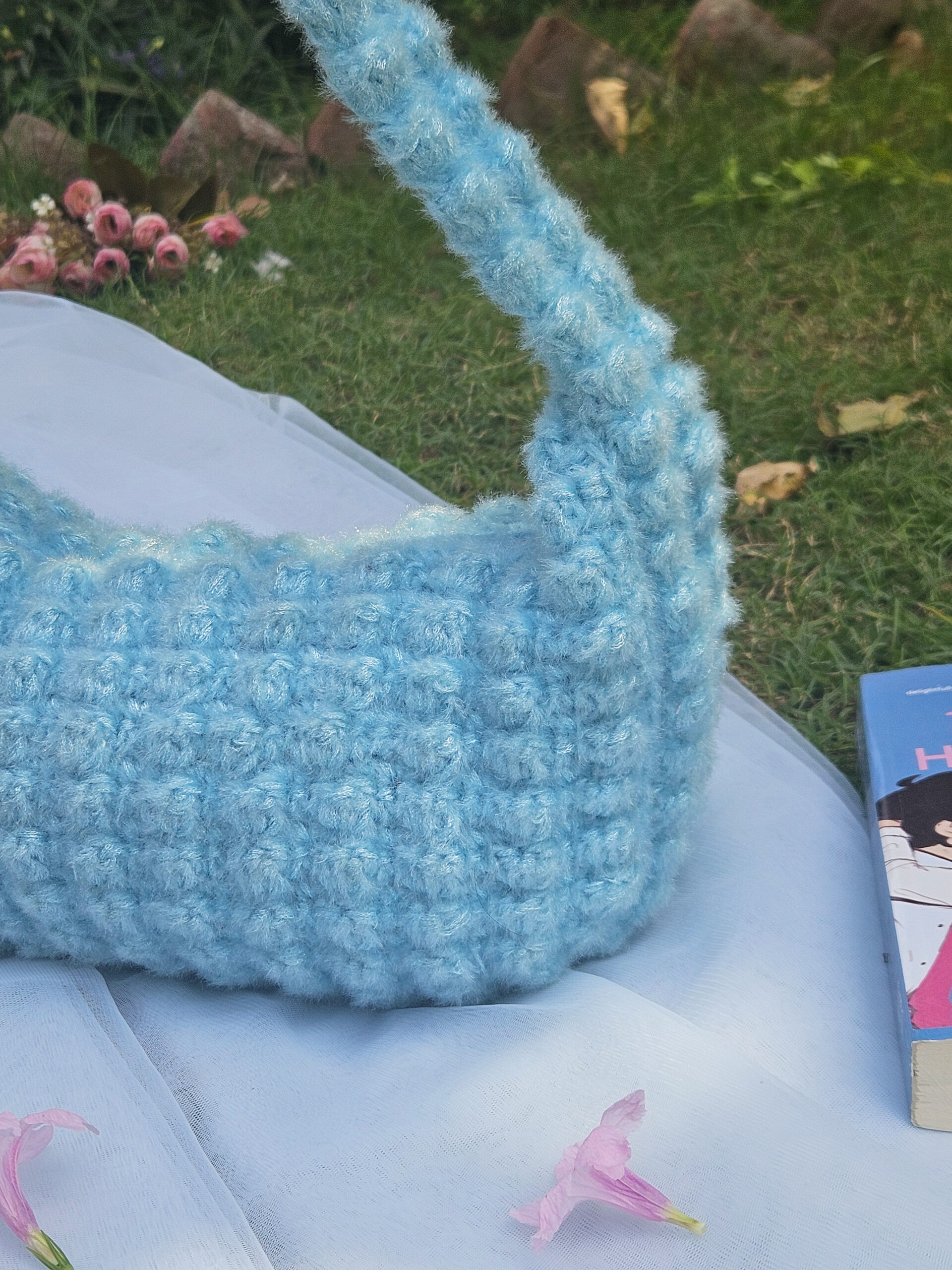 Design: Handcrafted with a playful bubble stitch in a calming blue shade.